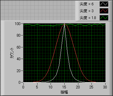 正規分布の尖度は3です。分布の尖度が3未満である場合、その分布が正規分布よりも平らであることがわかります。尖度の値が3より大きい分布は、正規分布よりも鋭角的です。以下のフロントパネルの図は、尖度が6、3、1.8の分布を表しています。