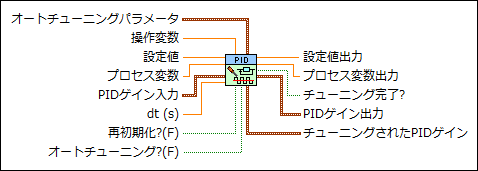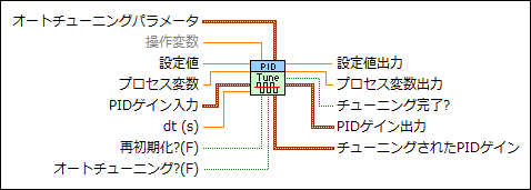 チューニング完了?は、オートチューニングプロセスが完了したときにTRUEを返します。この出力を使用して、PIDゲイン入力を更新するタイミングを.決定することができます。 | ||||||||||||||||||||||