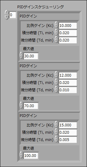 「PIDゲインスケジューリング」VIのPIDゲインスケジューリング入力は、PIDゲインとそれに対応する最大値のクラスタの配列です。PIDゲインの各セットは、配列の前の要素の最大値から配列の同じ要素の最大値までの範囲の入力値に対応します。PIDゲインスケジューリングの最初の要素のPIDゲインの入力範囲は、対応する最大値以下のすべての値です。