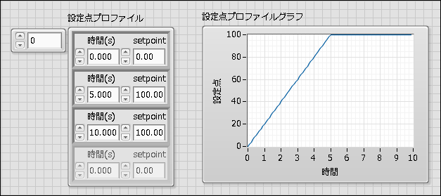 「PID設定値プロファイル」VIは、現在の経過時間から決まる1つの設定値を返します。設定値プロファイルの現在の時間は、初めてVIが呼び出された時に0に初期化されます。以降の呼び出し時には、前回の時刻と現在の時刻の経過時間を計算して、dt入力が計算されます。再初期化?入力にTRUEを渡して現在の時間を0に再初期化すれば、指定された設定値プロファイルを繰り返しことができます。
