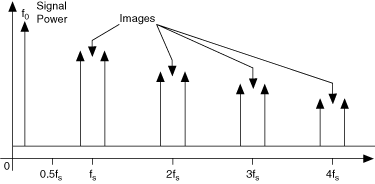 デジタル波形を正確に生成するには、希望とするアナログ信号の帯域幅の2倍以上の速さでデジタル波形をアップデートする必要があります(シャノンのサンプリング定理)。以下の図にあるように、サンプルクロックの理論値 (fs) が信号帯域幅の理論値 (fo) の2倍であっても、イメージは|f o ± nfs|で出力信号に表示されます。