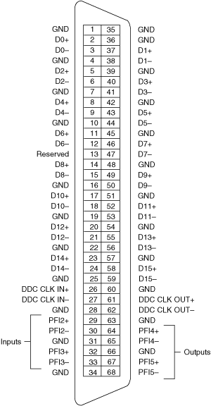 | D<0..15> | 出力 | デジタルパターン出力です。16ビットのアナログ波形のデジタル表現は、デジタルパターン出力としてこれらの出力で使用できます。このデータは、サンプルクロックのパイプライン遅延後に、メモリから直接使用することができます。デジタルパターン出力は、標準LVDS出力レベルです。すべてのデータビットは、DDC CLK OUTの立ち下がりエッジで変更されます。 |