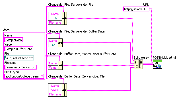 「POSTマルチパート」VIは、ポストデータクラスタの配列で表される複数のデータのセットをアップロードします。ポストデータ制御器の4通りの利用可能な組み合わせから、必要なものを選択し構成してください。たとえば、クライアントからバッファデータ文字列を受け取り、そのデータをファイルとしてサーバに送信します。