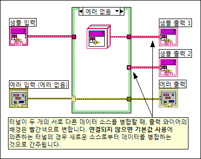 이 에러는 하나 또는 그 이상의 입력 터미널이 다른 소스에서 시작하거나 와이어가 런타임 타입 보존을 보장하지 않는 함수를 통과할 때 발생합니다. 또한, 바로 가기 메뉴에서 연결되지 않으면 기본값 사용을 선택하여 다이나믹 프런트패널 입력 터미널과 다이나믹 프런트패널 출력 터미널을 연결할 때 이 에러가 발생할 수도 있습니다.
