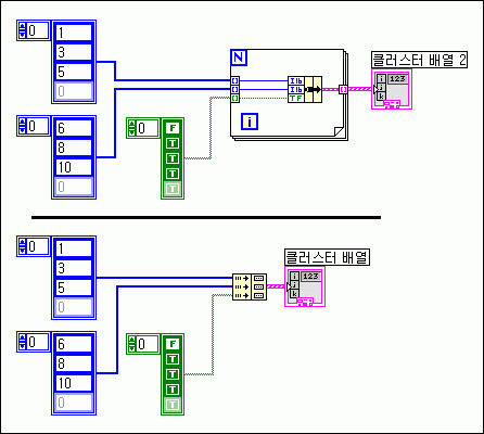 다음 블록다이어그램은 배열의 세트를 인덱스하고 클러스터를 만드는 2가지 방법을 설명합니다. [클러스터 배열 인덱스 및 묶기] 함수를 사용하면 구현 시간과 메모리 사용을 모두 개선할 수 있습니다.