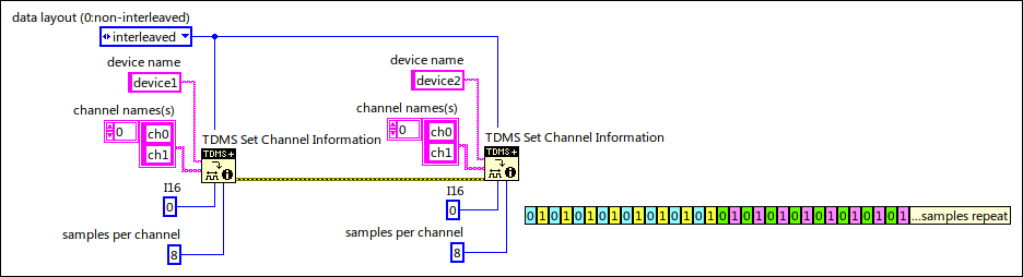 다음 예에서는 [TDMS 채널 정보 설정] 함수가 데이터 레이아웃 입력에 근거하여 원시 데이터를 정렬하는 방법을 보여줍니다.