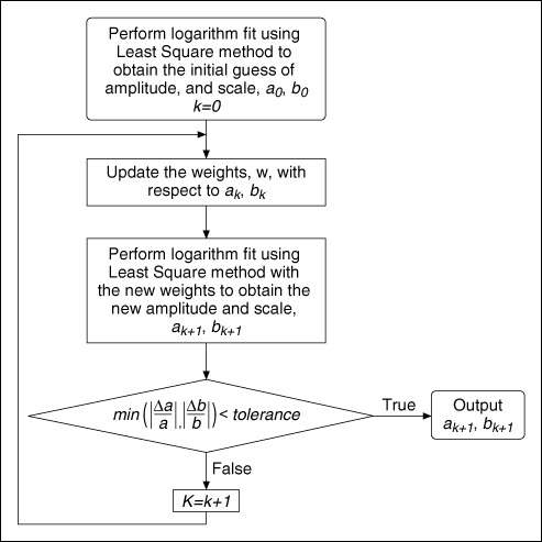바이스퀘어(Bisquare)법을 사용할 때, 이 VI는 다음 그림과 같이 반복 절차를 사용하여 진폭과 스케일을 얻고 최소 제곱법과 같은 수식을 이용하여 오차를 계산합니다.