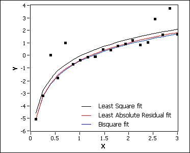 최소 절대 오차와 바이스퀘어(Bisquare)법은 강건한 피팅 방법입니다. 이러한 방법은 측정값 안에 특이점이 존재할 경우 사용합니다. 다음 그림은 최소 제곱, 최소 절대 오차 및 바이스퀘어(Bisquare) 피팅 방법의 피팅 결과를 비교합니다. 대부분의 경우, 바이스퀘어(Bisquare)법은 최소 절대 오차법보다 특이점에 대한 영향을 덜 받습니다.