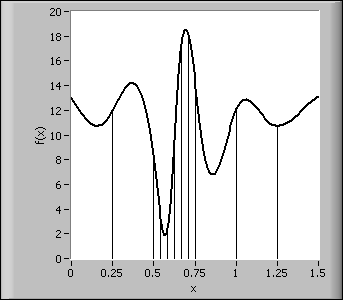 다음 프런트패널과 같이 피적분 f(x)가 급격히 변화할 때 높은 정확도를 얻기 위해 이 VI는 구간을 부분구간으로 나눕니다.
