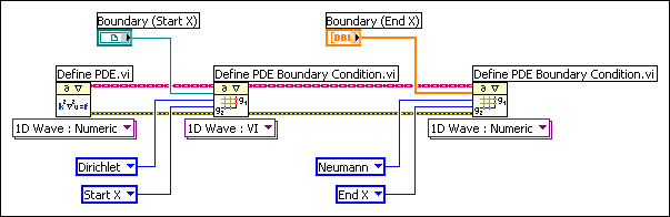 다음 블록다이어그램은 1차원 파동 방정식의 경계 조건을 정의하는 예제입니다. X 시작에서 경계 조건은 디리클레이며 VI로 정의합니다. X 끝에서 경계 조건은 노이만이며 숫자 배열로 정의합니다.