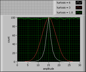 첨도를 결정할 때, 정규분포는 3의 첨도를 가집니다. 첨도값이 3보다 작은 경우, 정규 분포보다 더 평평함을 나타냅니다. 첨도값이 3보다 큰 경우에는 정규 분포보다 더 뾰족함을 나타냅니다. 다음 프런트패널 이미지는 각각 6,3,1.8의 첨도값을 가진 분포를 보여줍니다.