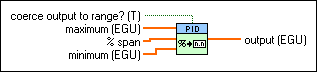 퍼센트 범위 입력을 최소 및 최대 범위 셋팅에 근거하여 공학 단위 출력으로 변환합니다. 이 출력은 일반적으로 [최대...최소] 범위로 제한됩니다. 특정 범위로 출력 강제 변환?이 거짓일 때 [최대...최소] 범위 밖의 값을 사용할 수 있습니다. 이 VI의 DBL 인스턴스를 사용하여 한 개의 컨트롤 루프를 구현합니다. 병렬 여러 루프 컨트롤을 구현하려면 DBL 배열 인스턴스를 사용합니다.