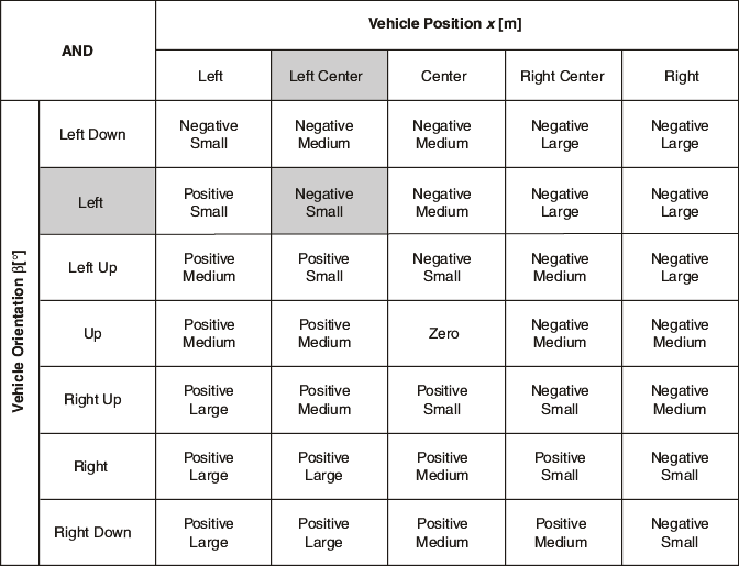 | IF 자동차의 위치 x is 왼쪽 가운데 AND 자동차의 방향 β is 왼쪽, THEN 조향 각도 φ is 음수 작음. |
