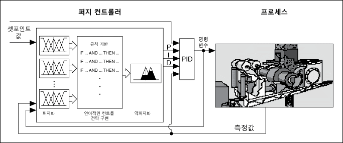 다음 그림은 PID 컨트롤 루프를 기반으로 하는 퍼지 컨트롤러의 컨트롤러 구조를 보여줍니다.