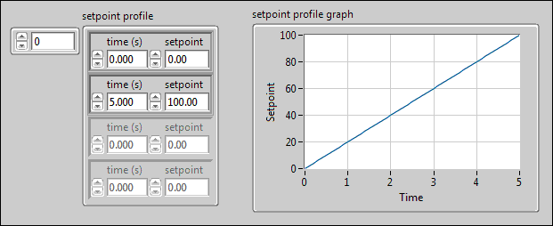 [PID 셋포인트 프로파일] VI는 현재 경과 시간을 사용하여 결정한 1개의 셋포인트 값을 반환합니다. VI를 처음 호출하면 셋포인트 프로파일의 현재 시간이 0으로 초기화됩니다. 그 다음 호출에서, VI는 이전 시간과 dt 입력값을 사용하여 현재 시간을 결정합니다. 다시 초기화? 입력에 참 값을 전달하여 현재 시간을 다시 0으로 초기화하면 지정한 셋포인트 프로파일을 반복할 수 있습니다.
