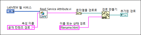 아래의 코드는 [서비스 속성 읽기] VI를 사용하여 웹 서비스의 공개 컨텐츠 폴더에서 특정 파일의 경로를 생성합니다.