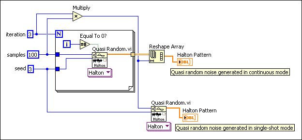可通过初始化VI按块生成较长的伪随机噪声序列。下列程序框图使用两种方法生成两个300采样的Halton序列。