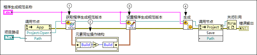 元素同址操作结构-读取获取程序生成规范版本VI返回的主、次、修正和生成版本号,并只递增生成版本号。 |