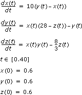 - F(X,t): [10*(y - x), x*(28 - z) - y, x*y - (8/3)*z]