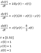 - F(X,t): [10*(y - x), x*(28 - z) - y, x*y - (8/3)*z]