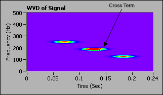 在所有的二次联合时频分析方法中,WVD具有最好的联合时频精度。但是,多元素信号的交期干扰可降低时频表示的精度,限制WVD方法的应用范围。下图所示的信号由两个高斯调制正弦波组成。第一个正弦波的频率为250 Hz,第二个正弦波的频率为125 Hz。两个正弦波的时间中心分别为0.075秒和0.18秒。