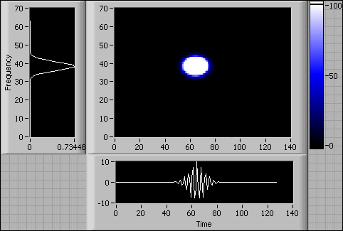下列前面板为WVD谱图和128点高斯调制正弦波的功率谱。时间增量为1。