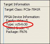- 查看终端信息文本框,了解FPGA的类型。xc5v的类型指示终端为Virtex-5 FPGA。xc6v的类型指示终端为Virtex-6 FPGA。例如,NI PCIe-7841R的类型为xc5vlx30,表明其为Virtex-5 FPGA且仅支持DSP48E函数: