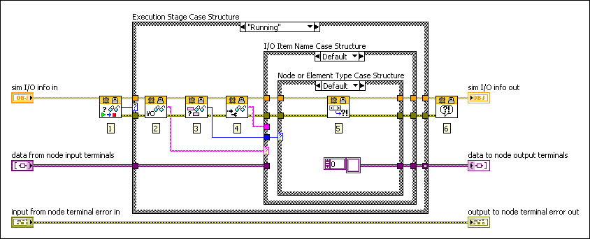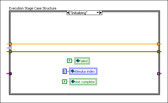 - 在Inverter VI的仿真I/O中,更新执行阶段条件结构的初始化条件分支,以初始化来自Test Bookkeeping VI的值,如以下程序框图中所示。LabVIEW为执行阶段条件结构的每个条件分支创建一个自定义VI的副本。如要在不同的分支间共享数据可使用全局变量。如下列程序框图所示;或使用某些包含副本条件分支的机制。例如,非重入子VI。
