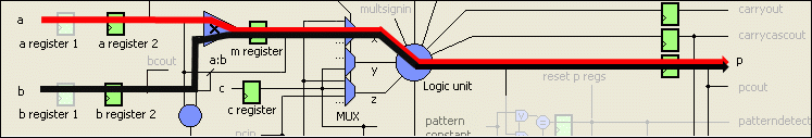假设函数被配置为乘法器,p = a 2。也就是连线相同的值到函数的a和b输入接线端。该值由0开始,每个时钟周期增加1。DSP48E函数包含下列数据路径: