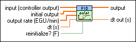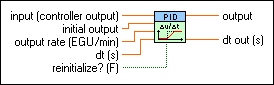 限制PID控制器输出变化率。使该VI紧随控制应用的PID VI之后。单控制循环可通过该VI的DBL实例实现。并行多循环控制可通过DBL数组实例实现。