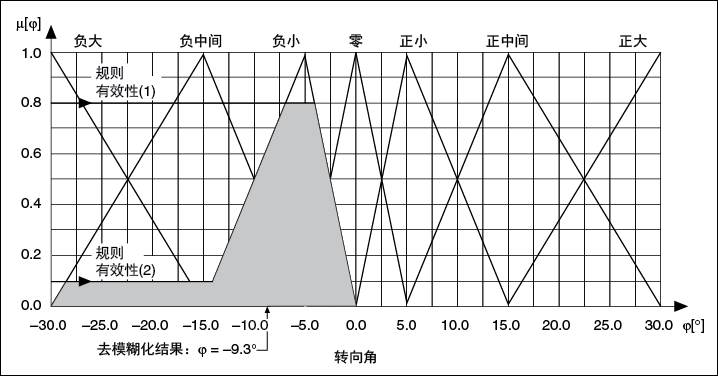 下图展示了汽车操控模糊系统转向角φ输出语言变量的面积中心去模糊化方法(假定最小值蕴含方法)。图中的阴影部分表示换算后隶属函数的面积。