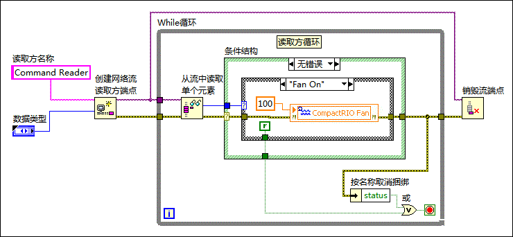 类似的,在下图中,从流中读取单个元素函数接收风扇关闭命令,条件结构执行风扇关闭分支,并将控制风扇的I/O变量设置为强度0,关闭风扇。