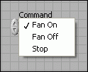 - 在读取方循环中,配置事件结构根据用户输入发送命令。例如,在下图中,用户单击Fan按钮时,向流中写入单个元素函数发送Fan On或Fan Off命令。