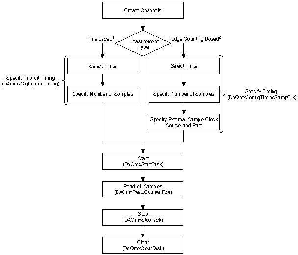 下列流程图描述了在NI-DAQmx应用程序中创建有限计数器输入所必须完成的步骤。另外,也可使用DAQ助手配置该任务。 1时间测量包括周期、半周期、脉冲宽度、两边沿间隔和数字频率。 2基于边沿计数的测量包括边沿计数、基于编码器的位置测量、GPS时间标识测量。 上级主题: 计数器的编程流程图