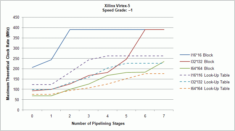 在上图中,每条线代表一个使用特定实现资源的具有特定大小的乘法器。例如,I32*I32 Block线显示了一个使用嵌入式块乘法器将2个32位有符号整数相乘的乘法器。结果为有符号64位整数:<+/–,32,32> × <+/–,32,32> = <+/–,64,64>。如在Virtex-II FPGA终端上使用一个流水线层级,该乘法器类型可获取的最大时钟速率约为51 MHz。如使用3个流水线层级,最大时钟速率约为76 MHz。