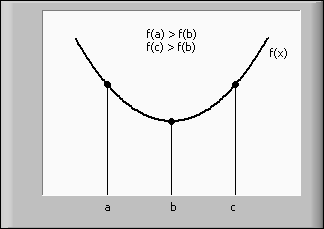 Beginning with a bracketing triplet (a, b, c), the Golden Section Search method determines a new bracketing triplet with a considerably smaller expansion. Repeating this scheme often yields a good approximation of the local minimum. The following equation essentially calculates the new bracketing point.