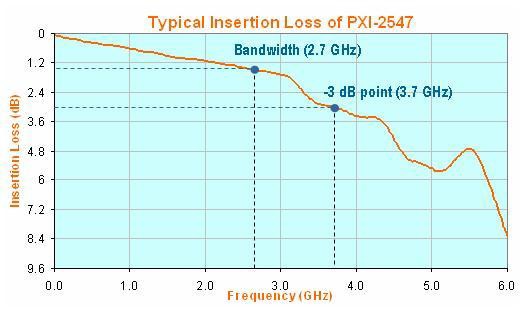 Bandwidth of a product is also thought, by many, to be its -3 dB bandwidth. This viewpoint is accurate for instruments such as digitizers where the bandwidth specification of the device is in fact the -3 dB point of the analog front end of the instrument. However, for an RF switch, the relation between bandwidth and -3 dB does not always hold true. While some vendors do in fact specify bandwidth at -3 dB, others do not. An example of this can be seen from the graph in Figure 8, which shows insertion loss of the NI PXI-2547 at its bandwidth (2.7 GHz) in conjunction with its -3 dB point (3.7 GHz).