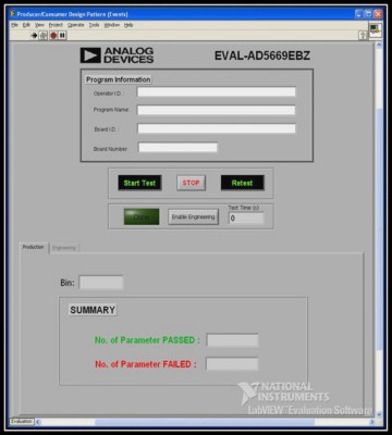 Figure 4 shows the software front panel developed for carrier device application board testing. The user interface consists of the program information box, where the operator keys in the necessary information; the button with which to initiate testing or start the retest; and the stop button. There is also an engineering mode button, which displays measurement indicators in the engineering tab for debugging; and lastly, the production tab (which shows by default) with which the operator can determine pass or fail results. The number of parameters to be tested is dependent on the specific device. Binning is determined in relation to pass or fail modes (for example, bin 1 for passed and bin 9 for continuity failure). The number of pass or fail parameters also displays.