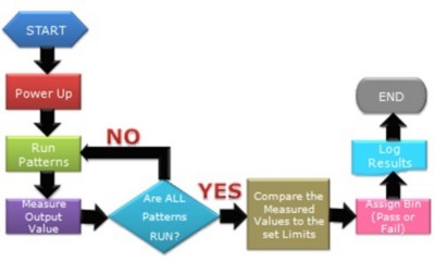 Figure 5 shows the simplified generic PXI-based application board tester method. Upon start-up, a PXI-4110 power supply provides power to the boards and its components. After the power sequence, a USB-6501 and PXI- 6556, using LabVIEW, generate the patterns that load onto the device. With every pattern, a PXI-4065 makes a corresponding measurement. Pattern-loading and output-measuring loop until all patterns have run. Measured outputs are compared to their limits and binned accordingly. Lastly, the results are logged and saved as a .txt file.