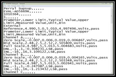 The system saves the data in text format, as shown in Figure 6. It can be translated manually as an Excel file for a more organized view. The data log contains information about the board under test, the operator working on the tester, and the list of parameters tested. Parameter names are found on the first column, followed by the lower limit, the typical specification, and the upper limit. The fifth column shows the measured value, its corresponding unit, and the bin assignment.