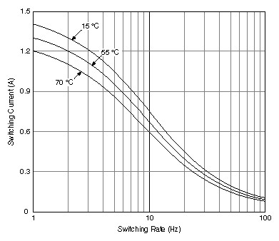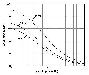 Figure 1 and Figure 2 display the maximum SSR switching characteristics based on channel count, ambient temperature, switching current, and switching rate. Refer to these graphs to determine the supported switching rate for your application.