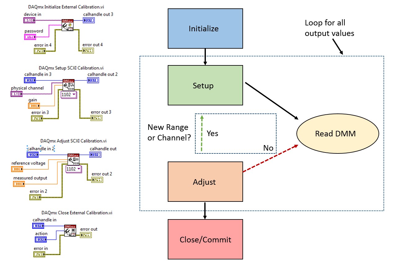 After your SCXI system is configured in MAX and DMM is connected, then refer to the following flow chart, and follow these steps for the calibrating your analog output SCXI module: