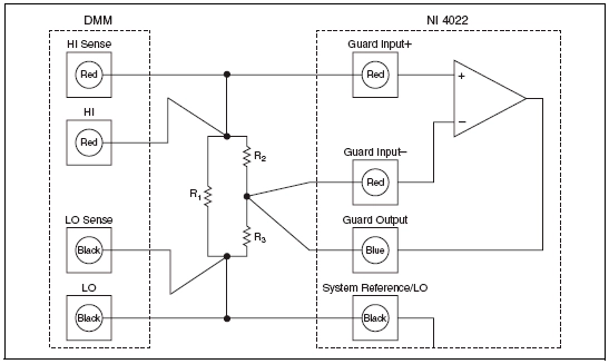 R1 is the resistor under test in the Figure 1. As the DMM sources the test current across it, some of that current would travel through R2 and R3 depending on their values. The configuration shown in Figure 1 uses the NI PXI-4022 guard and current amplifier module to apply a voltage between resistor R2 and resistor R3 that is equal to the voltage across R1. This applied voltage causes a voltage drop of zero across resistor R2. Thus, no current from the DMM flows through the path with resistors R2 and R3, effectively canceling the effects of these resistors from the measurement. A voltage exists across resistor R3 equal to the voltage across resistor R1, but that current is being supplied by the guard amplifier. In this sense, R1 is guarded. The same theory applies when the network consists of capacitors.