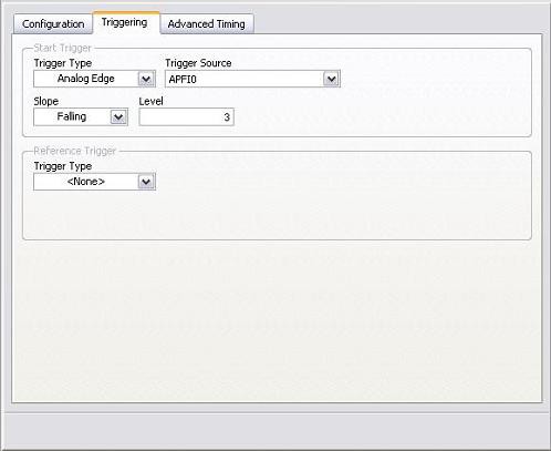 The NI-DAQmx trigger class configures a trigger to perform a specific action. The most commonly used actions are a start trigger and a reference trigger. NI-DAQmx also supports the following trigger configurations: