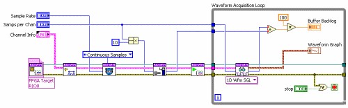 Continuous Acquisition with Start/Stop or Pause Functionality: If a finite acquisition is too large for the amount of memory available on the host controller, then perform a continuous acquisition for a finite period of time via a state machine. When you call Stop.vi, the FPGA stops the acquisition and immediately rearms itself waiting for Start.vi to be called. The stop VI also flushes the host application's data buffer so subsequent acquisitions do not return old data.