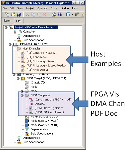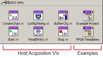 cRIO Wfm Examples.lvproj demonstrates common acquisition modes and how to link host code to FPGA code. The example is installed as a Sample Project in your LabVIEW environment and can be opened from the Create Project... option in the launch window.