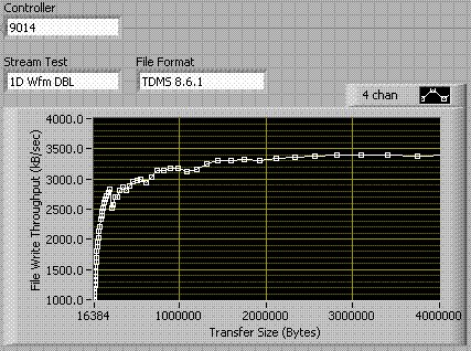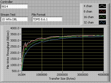 We can draw several conclusions from Figure 1 but one of the most obvious is that the streaming performance improves as larger and larger block sizes are written. When using the 9014 you must save data blocks at least 1MB in size to get the best streaming rates. If this data had been acquired from 4 channels of an NI 9234 C Series module, that would correspond to about 60,000 samples per channel.