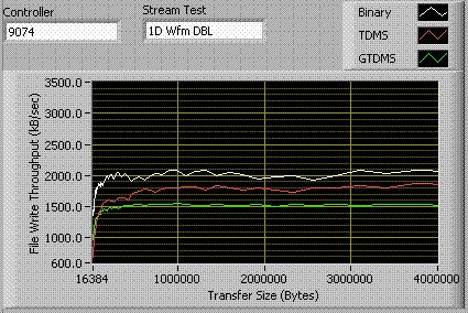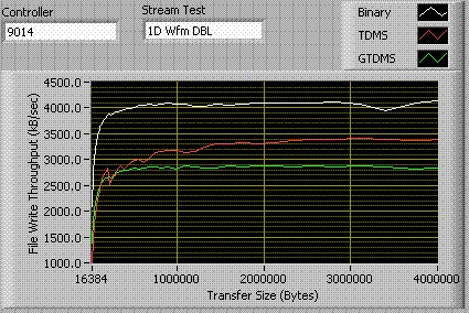 Figure 3 shows how streaming performance is affected by both block size and file format. The performance differences between GTDMS, TDMS, and Binary is similar across cRIO controllers and the datatype you are streaming with (1D Wfm, 2D DBL, etc.)
