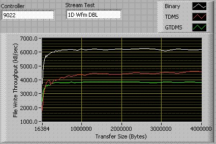 Streaming performance depends on the size of the data block you are attempting to write. Figure 1 represents a series of tests where 1D Array of Waveform data is streamed to a TDMS file. Each point represents one streaming test where the same block of data is saved over and over for 5 seconds and an average streaming rate is calculated. The block size (or data array size) increases for each test so the streaming benchmark essentially sweeps the data block size and displays the average streaming performance for each block size.
