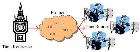 Another method of visualizing this transfer of time data via time protocols is the clock tower/wristwatch analogy. Think of the master node as being the clock tower and the slave nodes as being the people in a small town. Everyone in the town must be at work at 8:00 a.m. and they all have their own wristwatches. But each person’s wristwatch could be different, and there might be confusion over the correct current time. If each person looks at the clock tower and resets, or synchronizes, his or her wristwatch to the clock tower time reference, then everyone has the right time and arrives at work on time. The same conveyance of time information takes place in time-referenced systems.